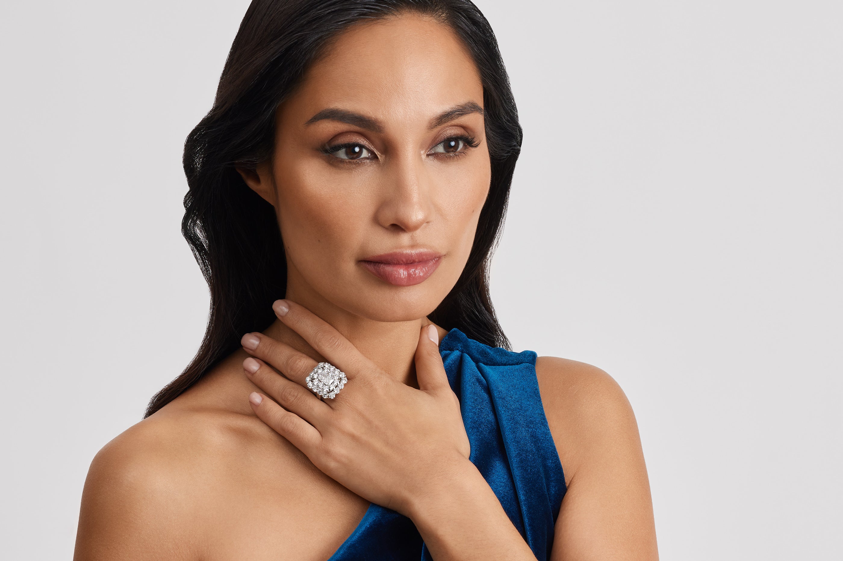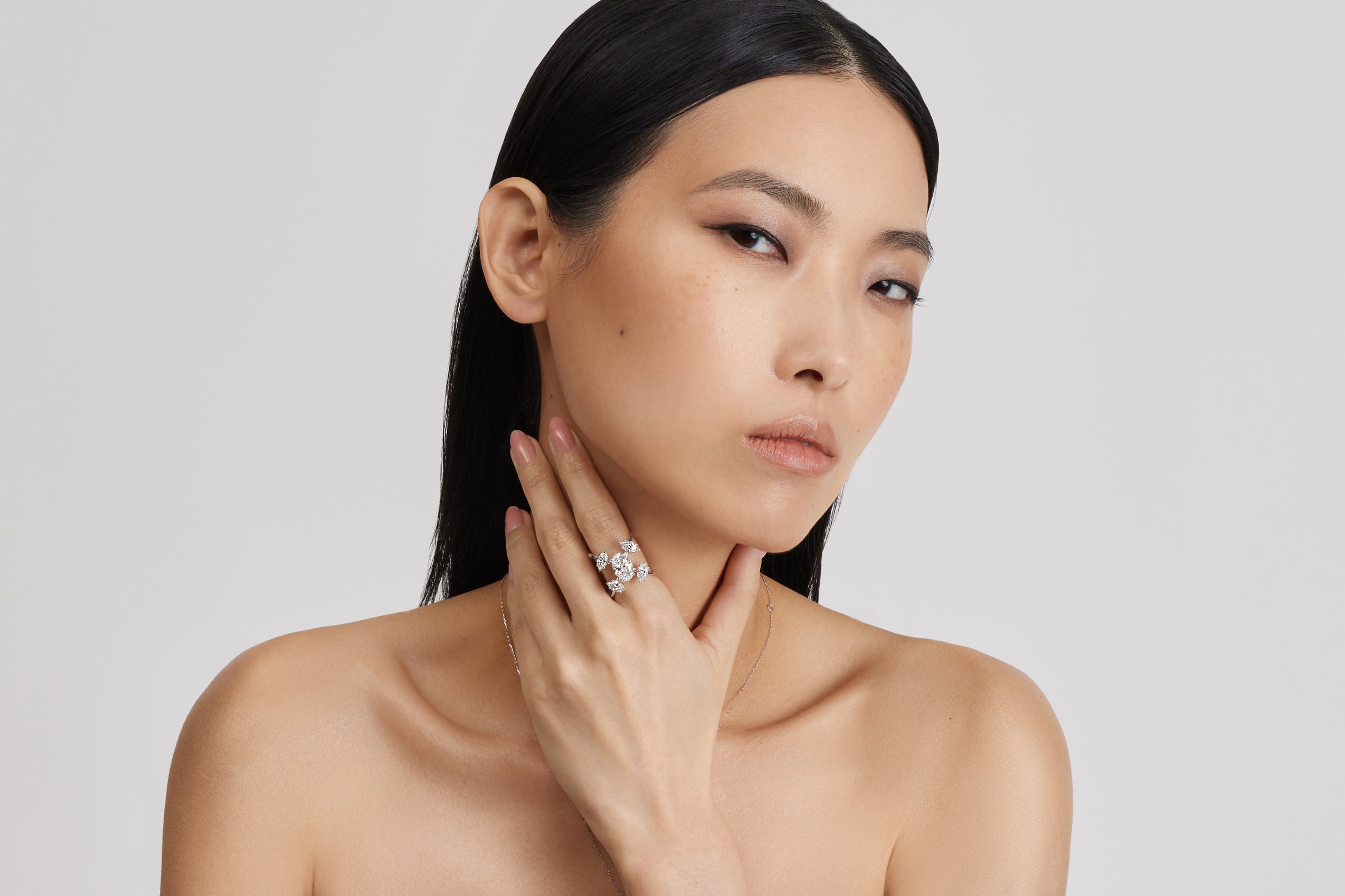 Discover the refined elegance of the Magari Ring, a dazzling cocktail ring where two bands of 18k gold converge in perfect harmony. At its center lies a 3.01-carat oval diamond, encircled by a luminous array of marquise diamonds like glistening stars in the night sky. This masterful piece of wearable art is designed to be cherished for a lifetime.