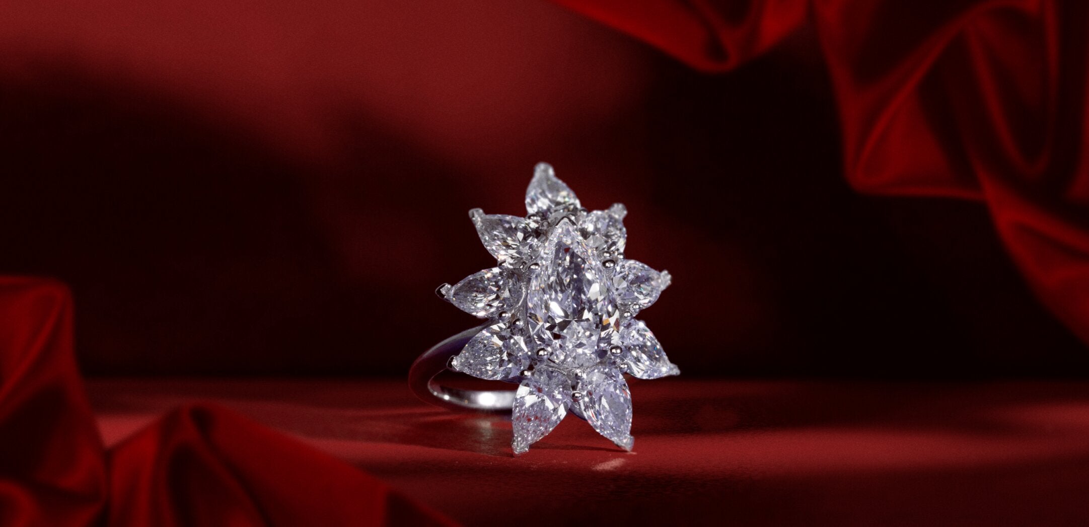 Experience the ethereal beauty of the Alta Ring, a floral-inspired masterpiece that captures the essence of nature's elegance. At its center is a 3.01-carat pear-shaped diamond, surrounded by a radiant halo of marquise diamonds totaling 4.65 carats. Set in 18k gold, this ring is an embodiment of purity, grace, and timeless allure.